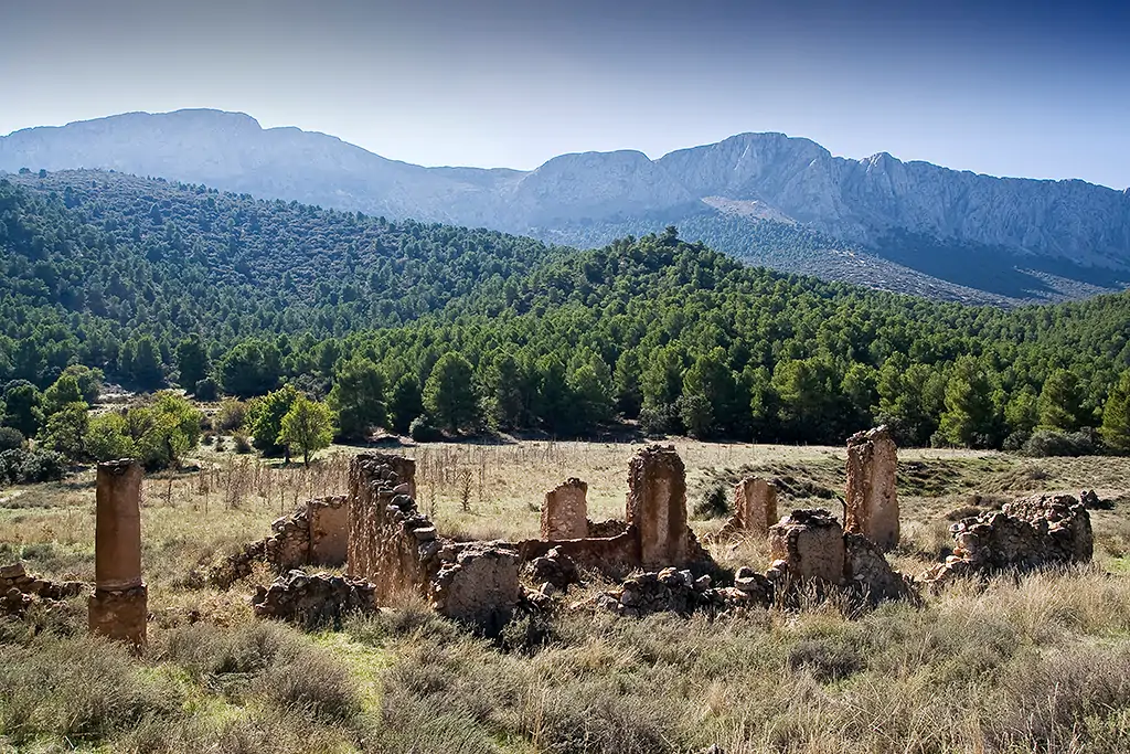 En este punto, presta atención a las ruinas. Verás restos de antiguas viviendas y, lo más interesante, la antigua fábrica de resinas. La resinación fue una industria crucial en estos montes durante el siglo XX, aprovechando la abundancia de Pinus pinaster y Pinus halepensis. Estas piedras caídas nos hablan de un tiempo en que el bosque era la principal fábrica de la comarca.